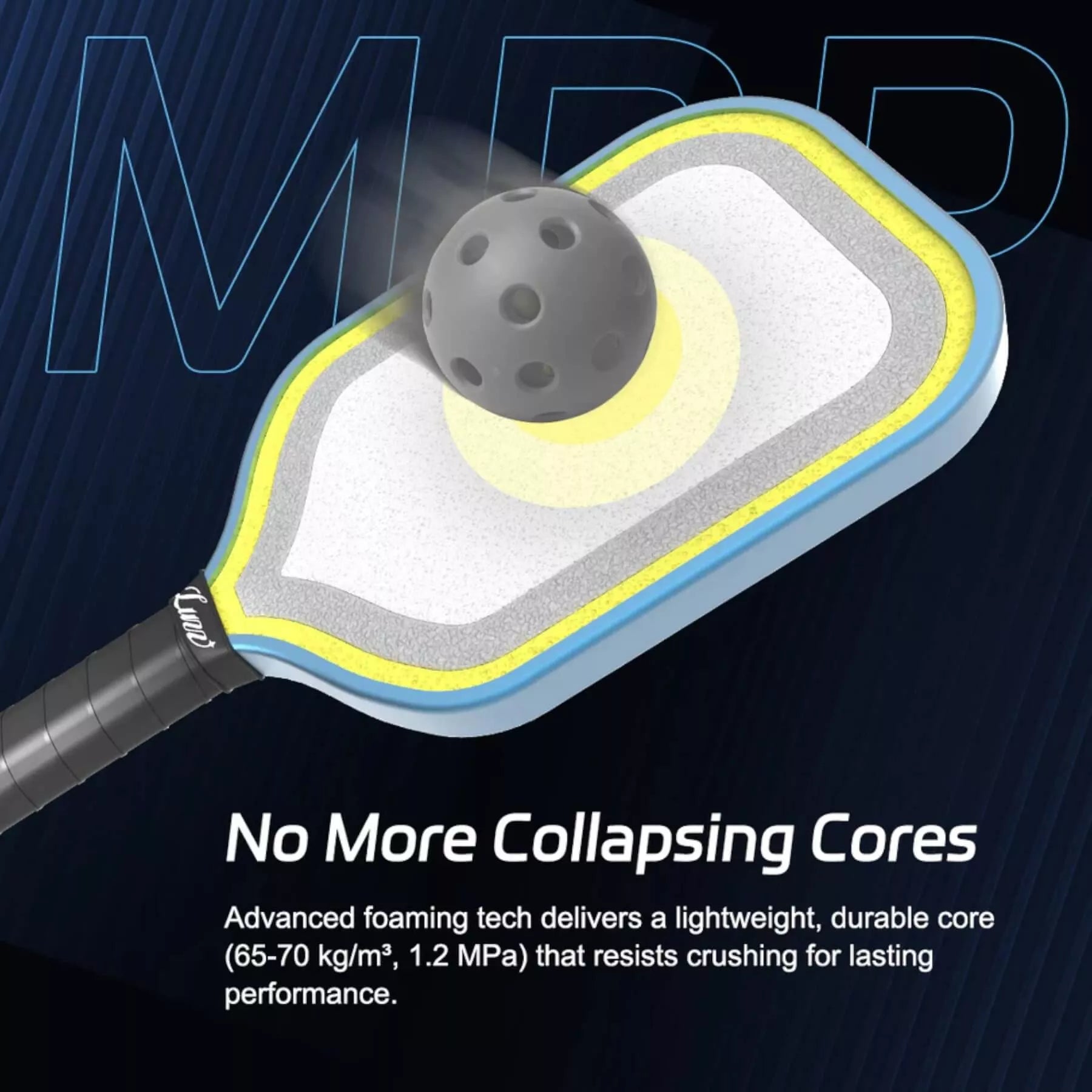 • Microporous Polymer (MPP) Core: Engineered with a unique micro-cell structure that delievers explosive energy transfer, an expanded sweet spot, shock absorbption of over 90% of impact energy and crush resistance that stays powerful game after game.